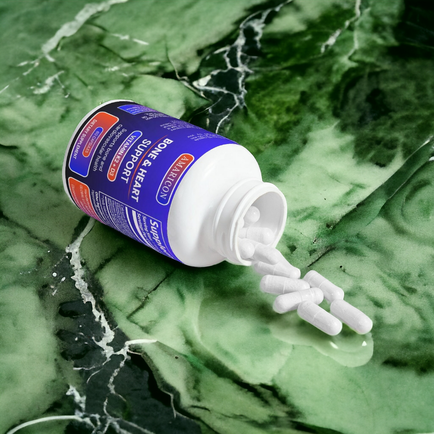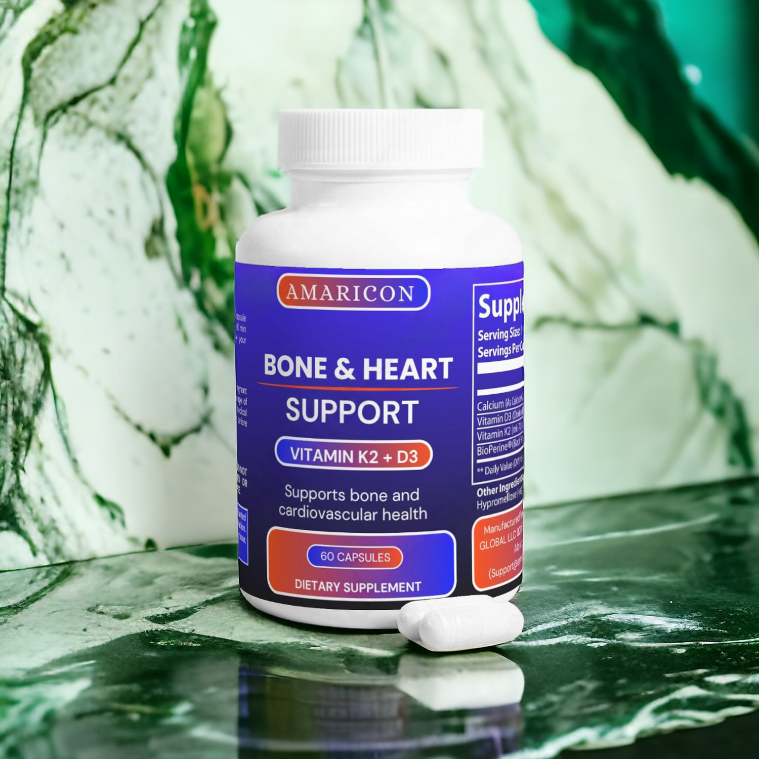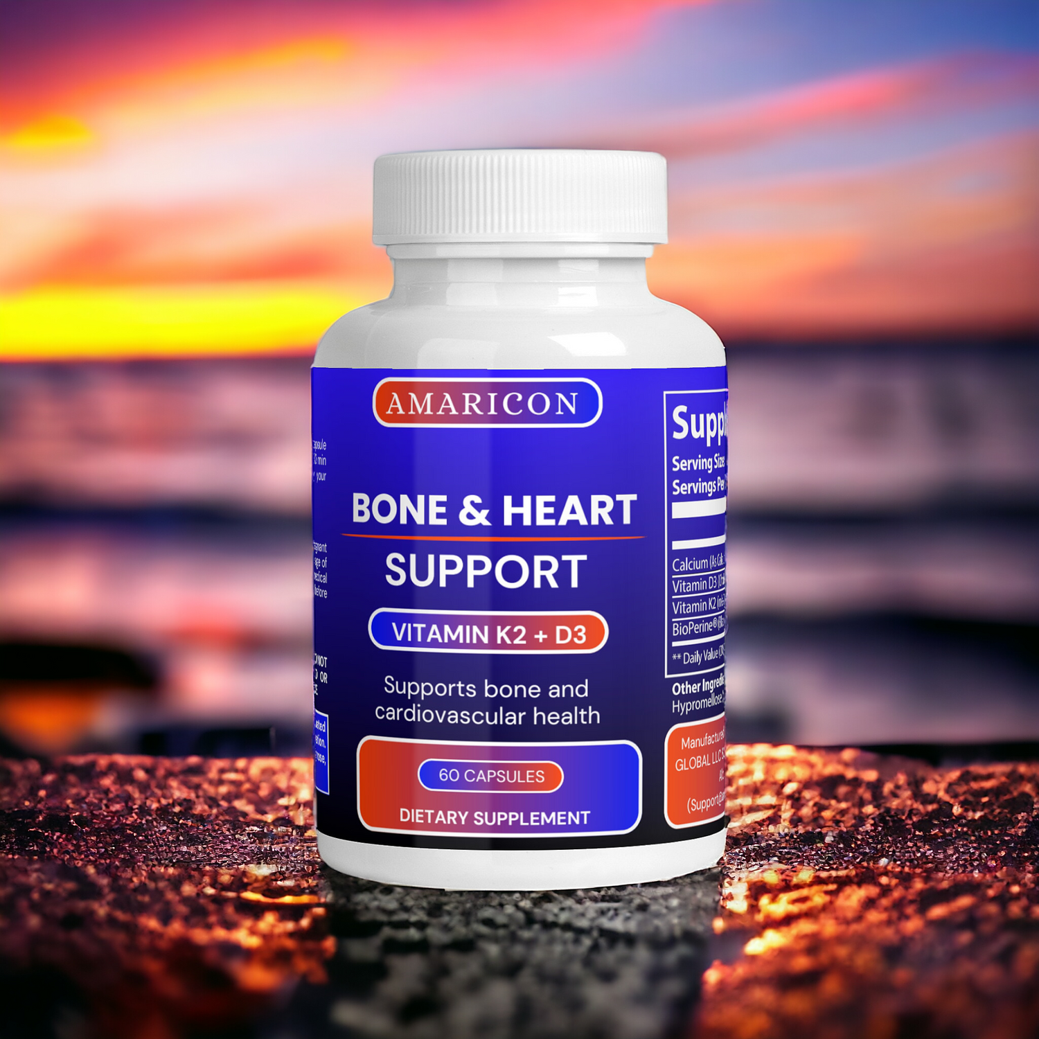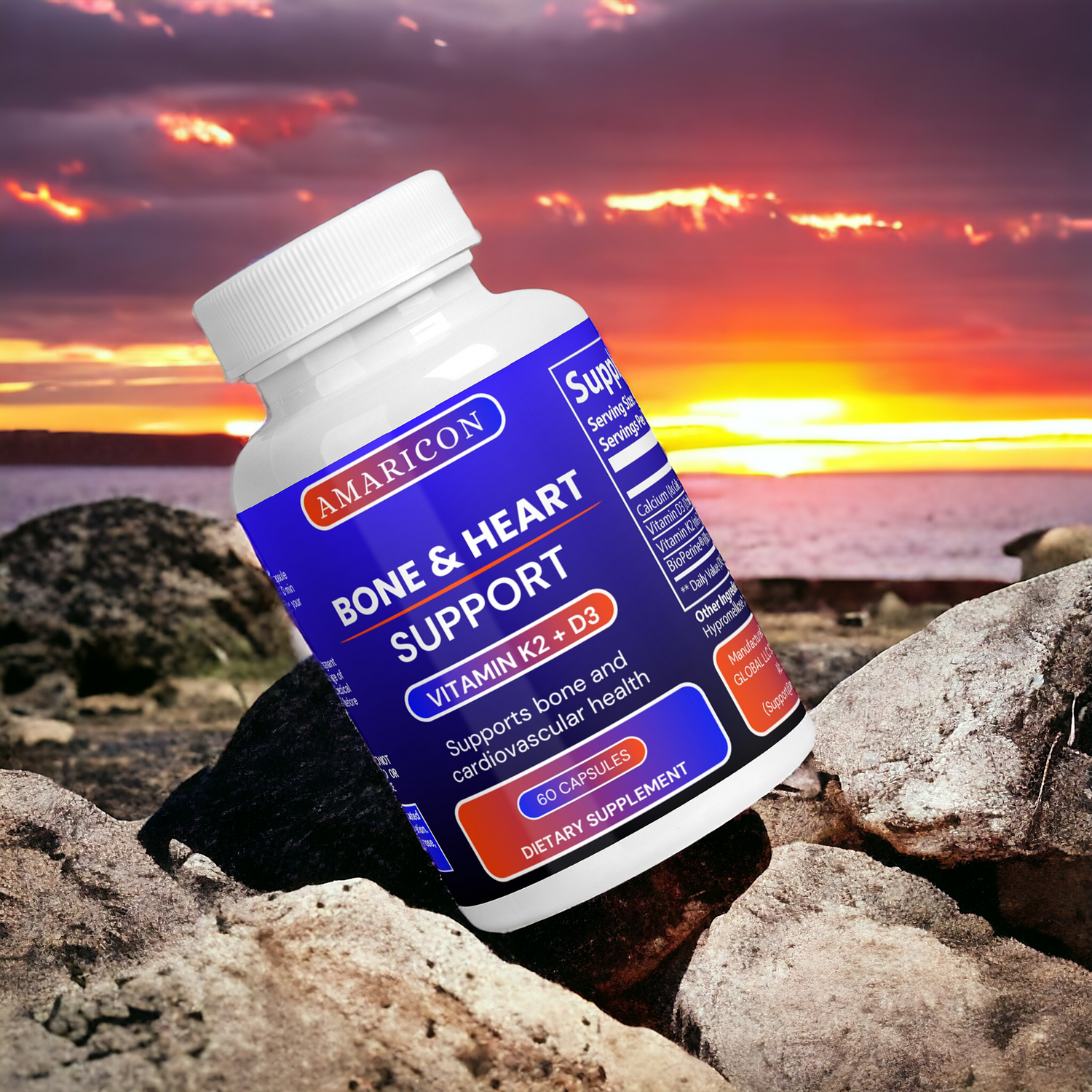 AMARICON Bone & Heart Support is a supplement that combines Vitamin D3, Vitamin K2, and Calcium to support bone health and cardiovascular wellness. It aids in the absorption of calcium to strengthen bones and joints while promoting healthy blood circulation and heart function.