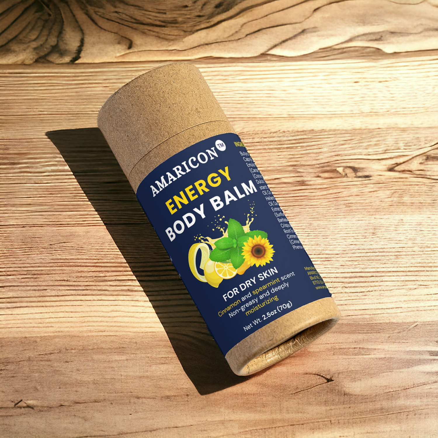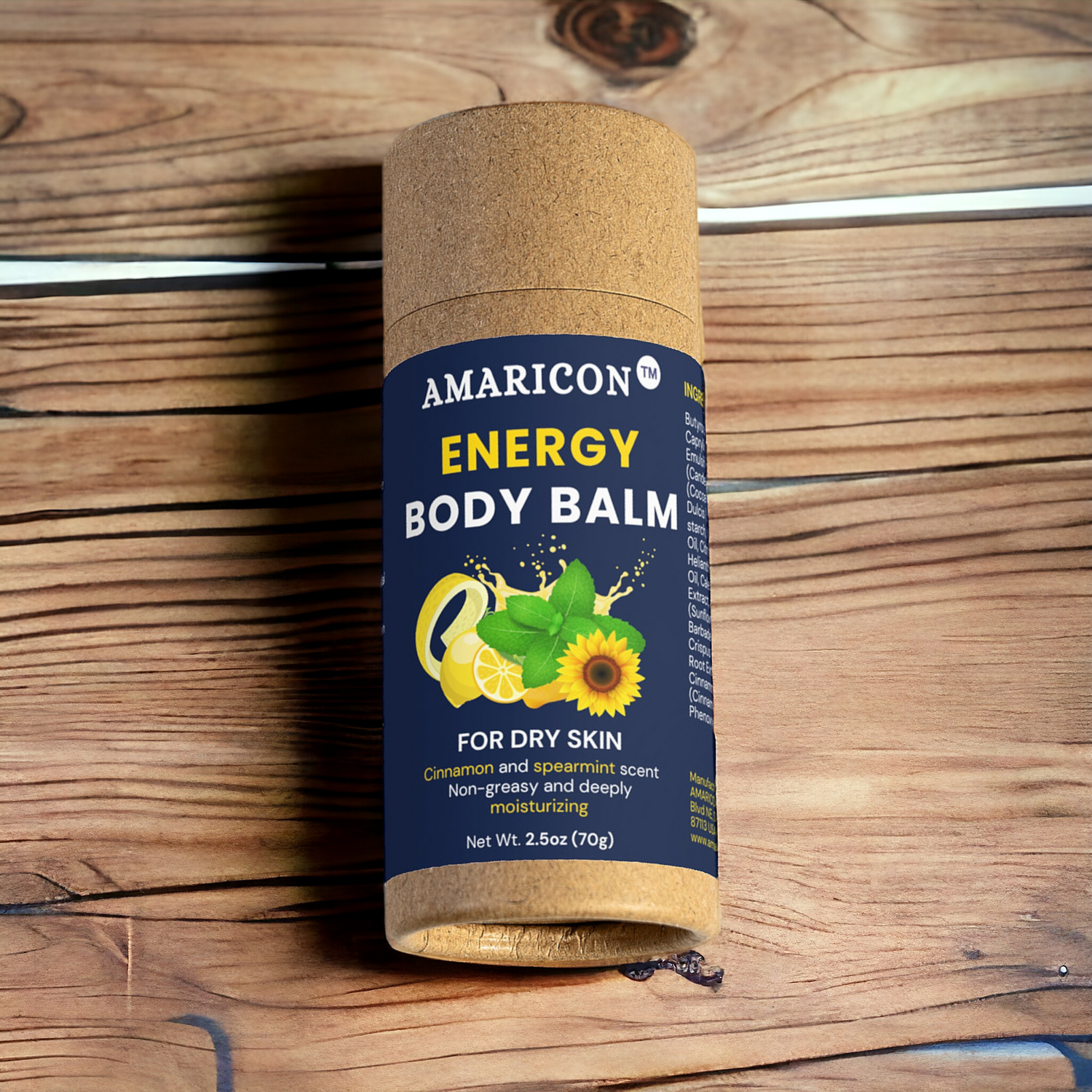 AMARICON Energy Body Balm is an all-natural, deeply moisturizing balm designed to replenish dry skin and provide soothing aromatherapy benefits. It is scented with Cinnamon, Spearmint, and Lemon Oils to energize and uplift your senses while offering long-lasting hydration.
