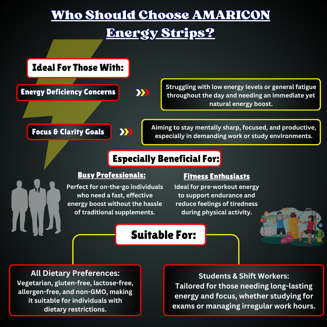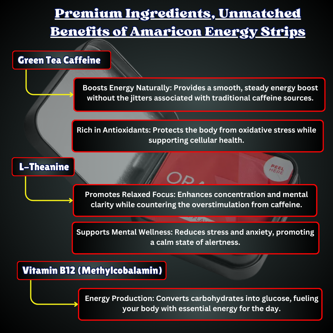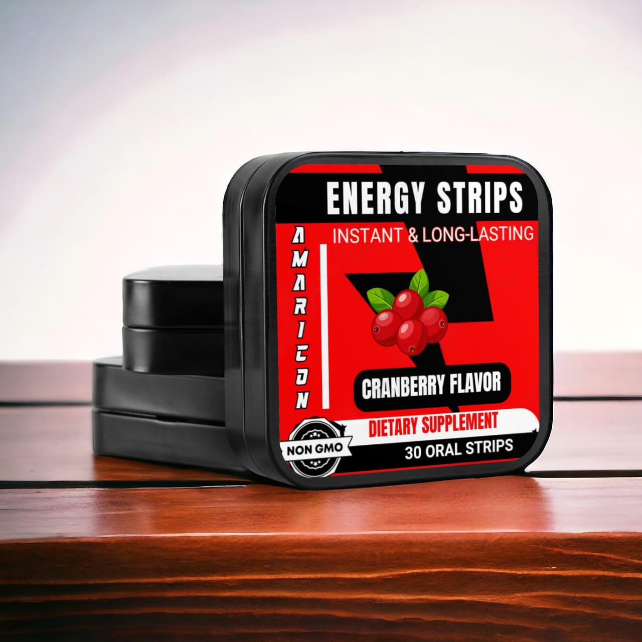 AMARICON Energy Strips are a convenient supplement designed to provide sustained energy, improved focus, and mental clarity. They contain Green Tea Caffeine, L-Theanine, and Vitamin B12 to help combat fatigue and boost endurance without the sugar crash common with energy drinks.