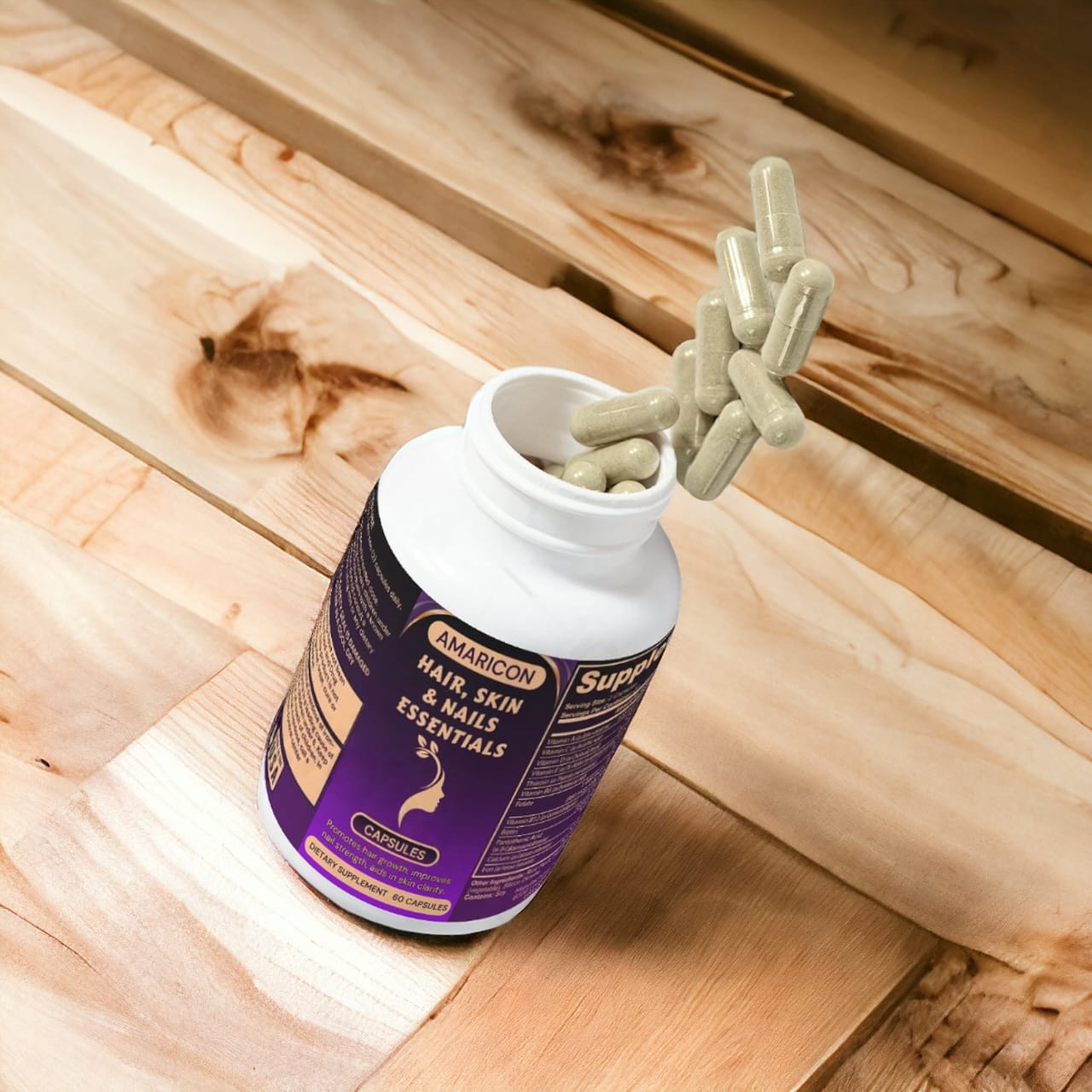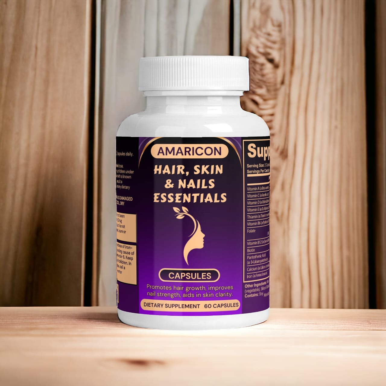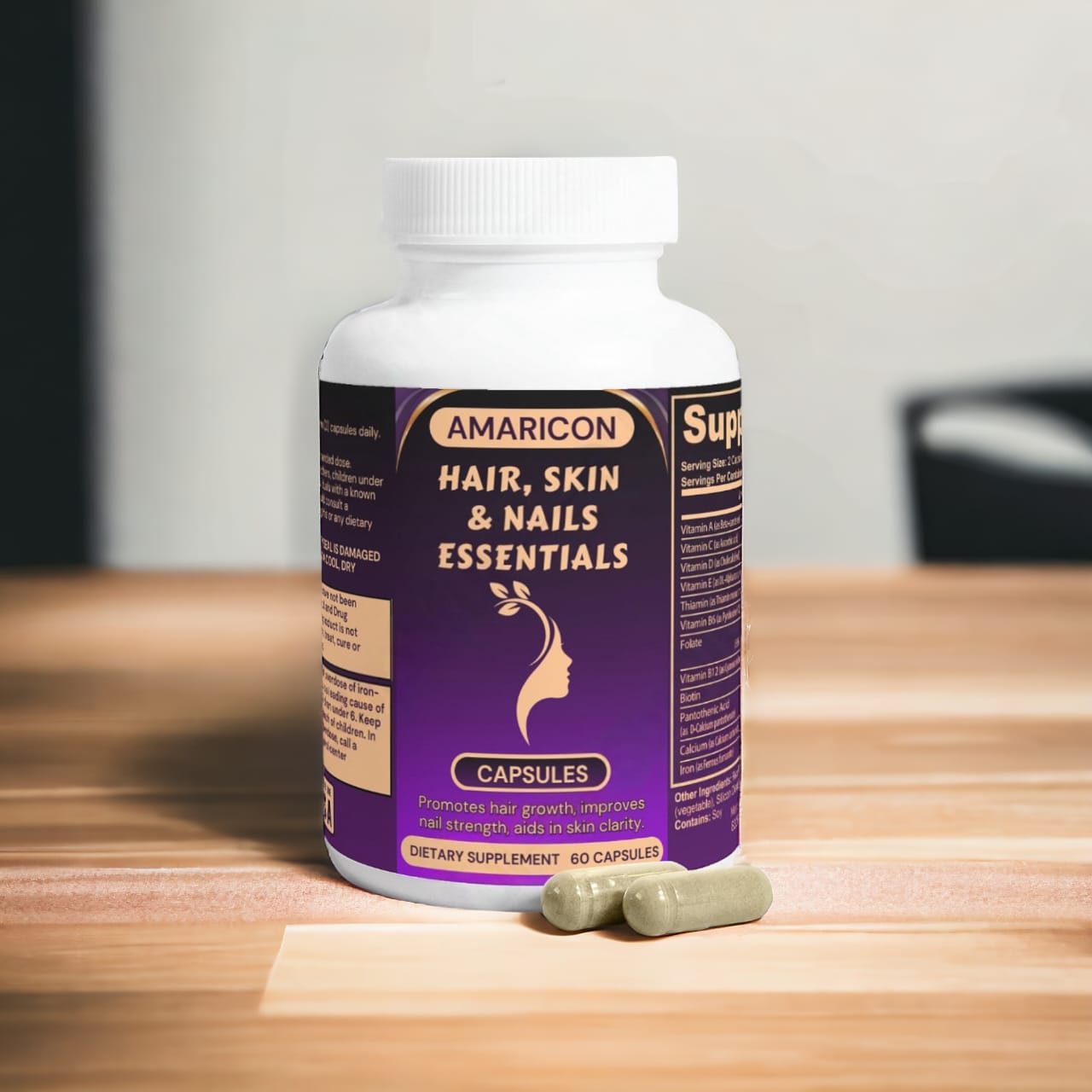 AMARICON Hair, Skin, and Nails Essentials is a supplement formulated with essential vitamins and minerals, including Vitamins B6, B7 (Biotin), and B9 (Folate), designed to support healthy hair growth, strong nails, and enriched skin for a natural, radiant glow.