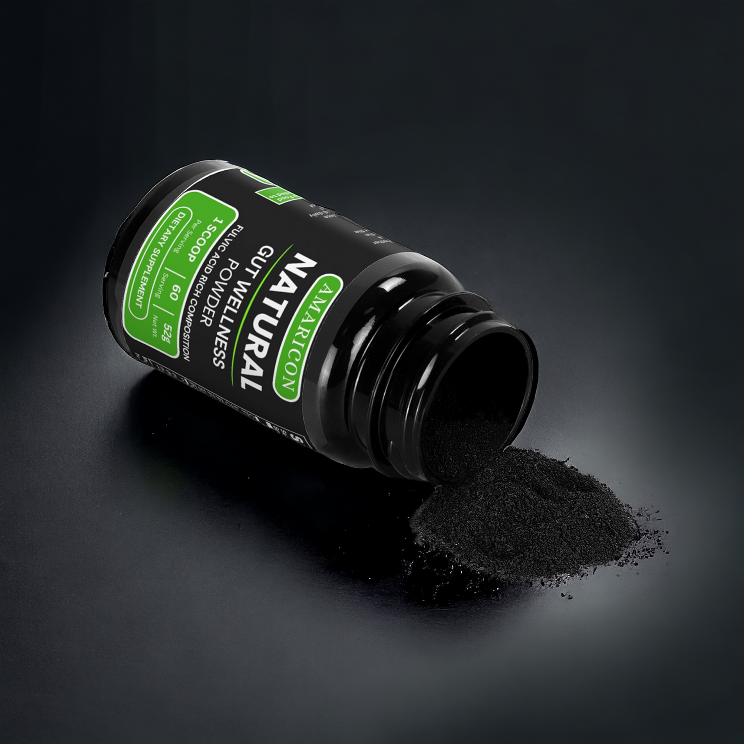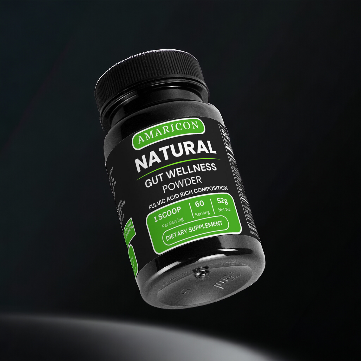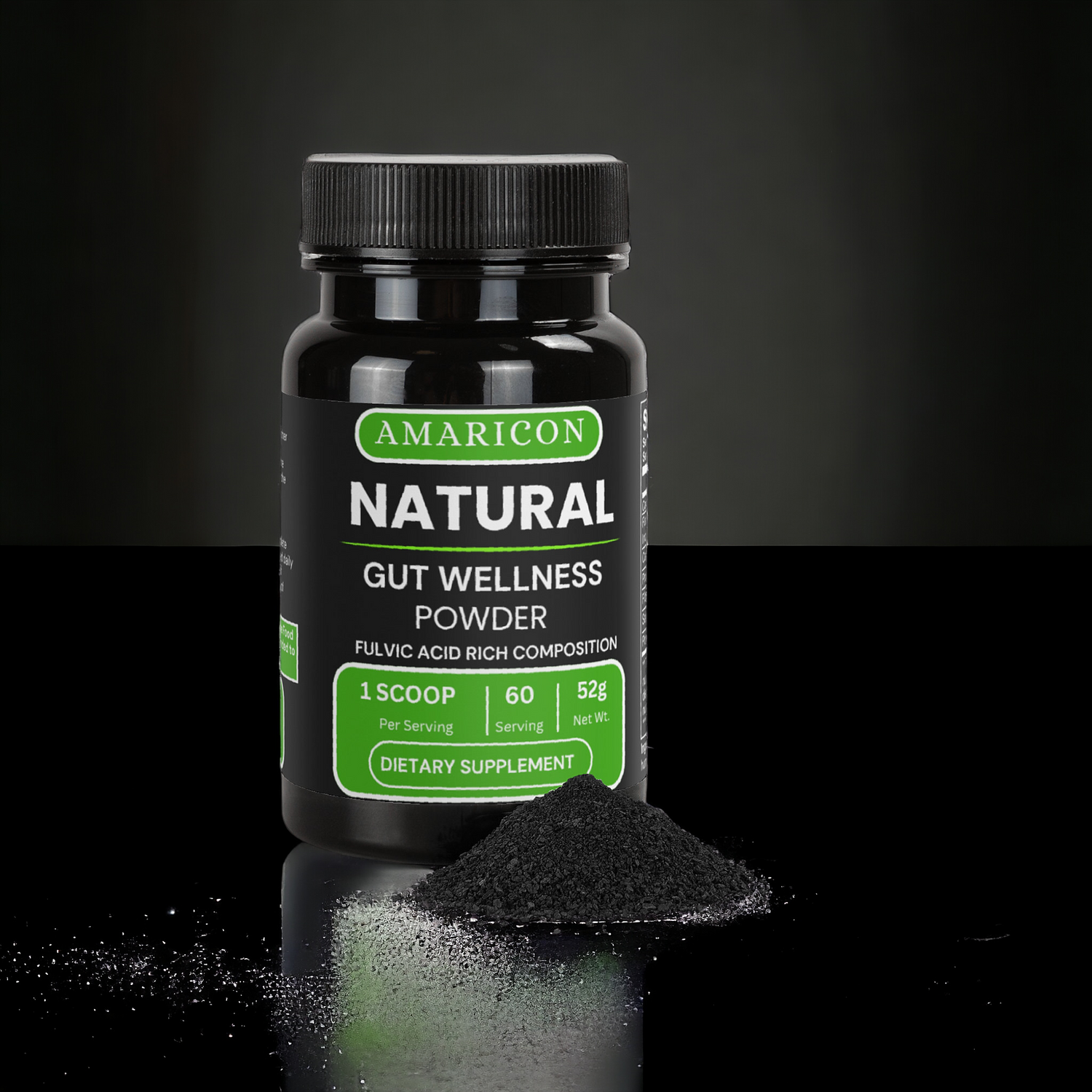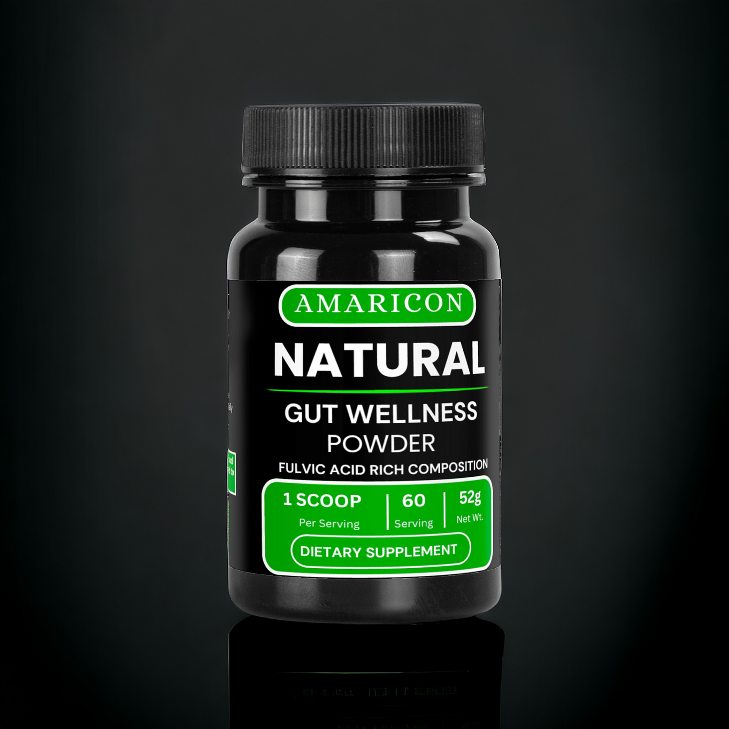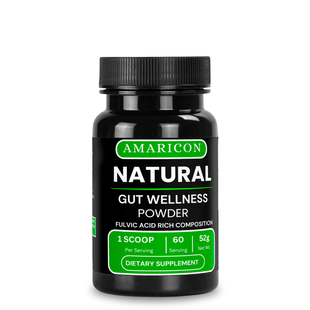 AMARICON Natural Gut Wellness Powder is a dietary supplement formulated with fulvic acids and polyphenols from Birch Chaga and Pine Bark Extract to promote gut health and smooth bowel functions.