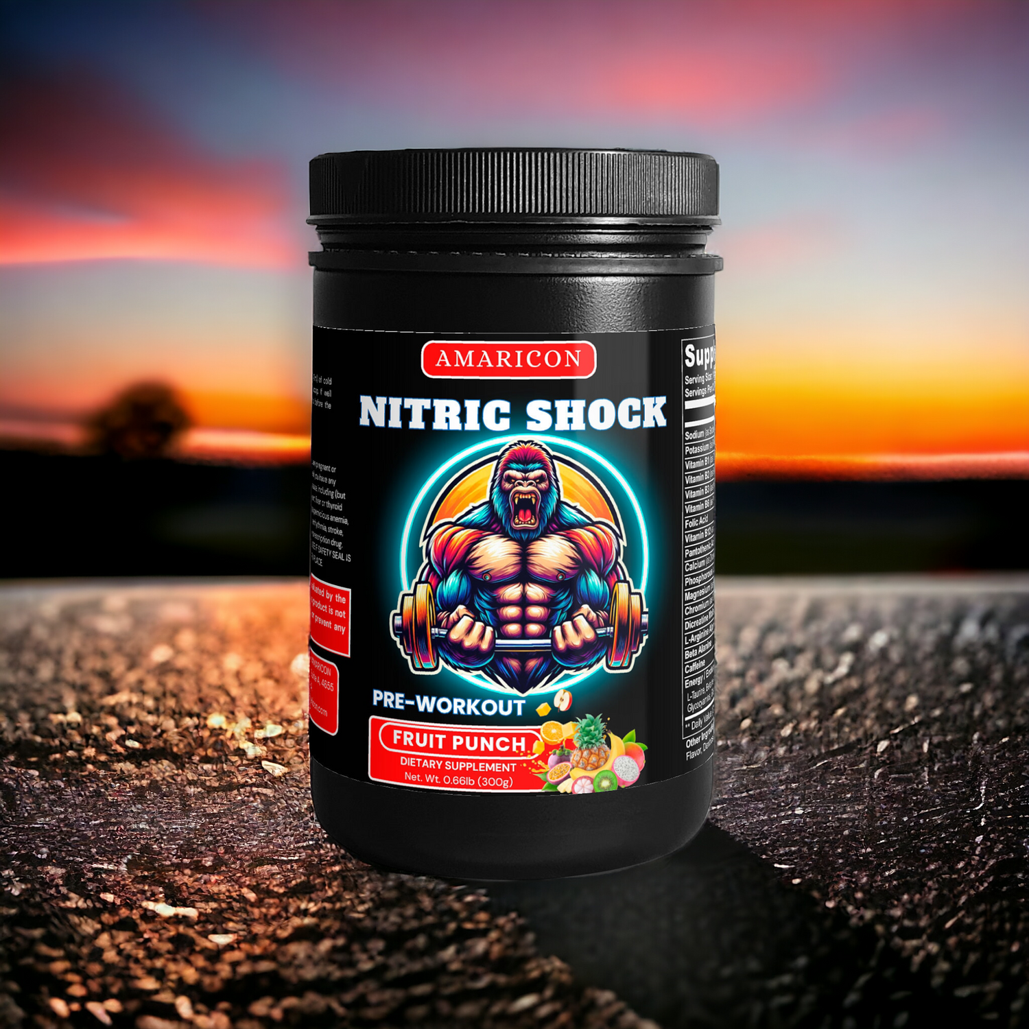 Elevate your fitness game with AMARICON™ Nitric Shock Pre-Workout Powder (Fruit Punch) and conquer your goals with unmatched energy and strength.