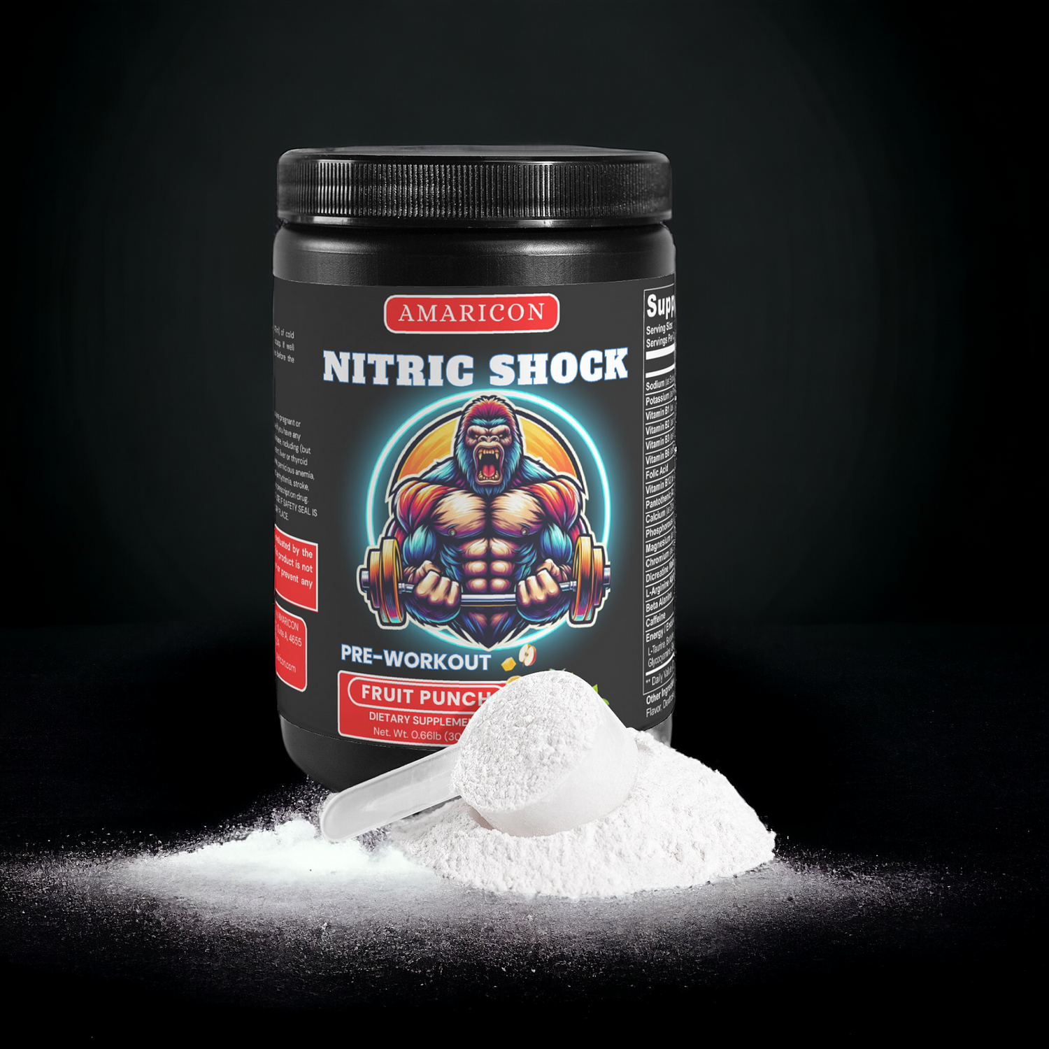 AMARICON™ Nitric Shock Pre-Workout Powder (Fruit Punch) is your go-to supplement for achieving peak energy and focus. Packed with caffeine, L-tyrosine, and a B-vitamin complex, it delivers the mental clarity and stamina you need to power through challenging workouts.