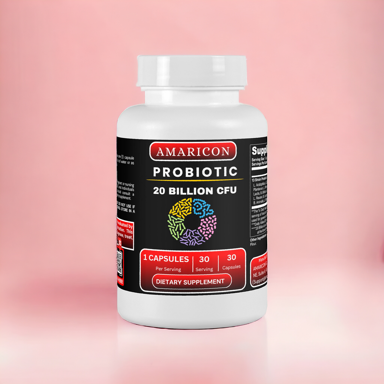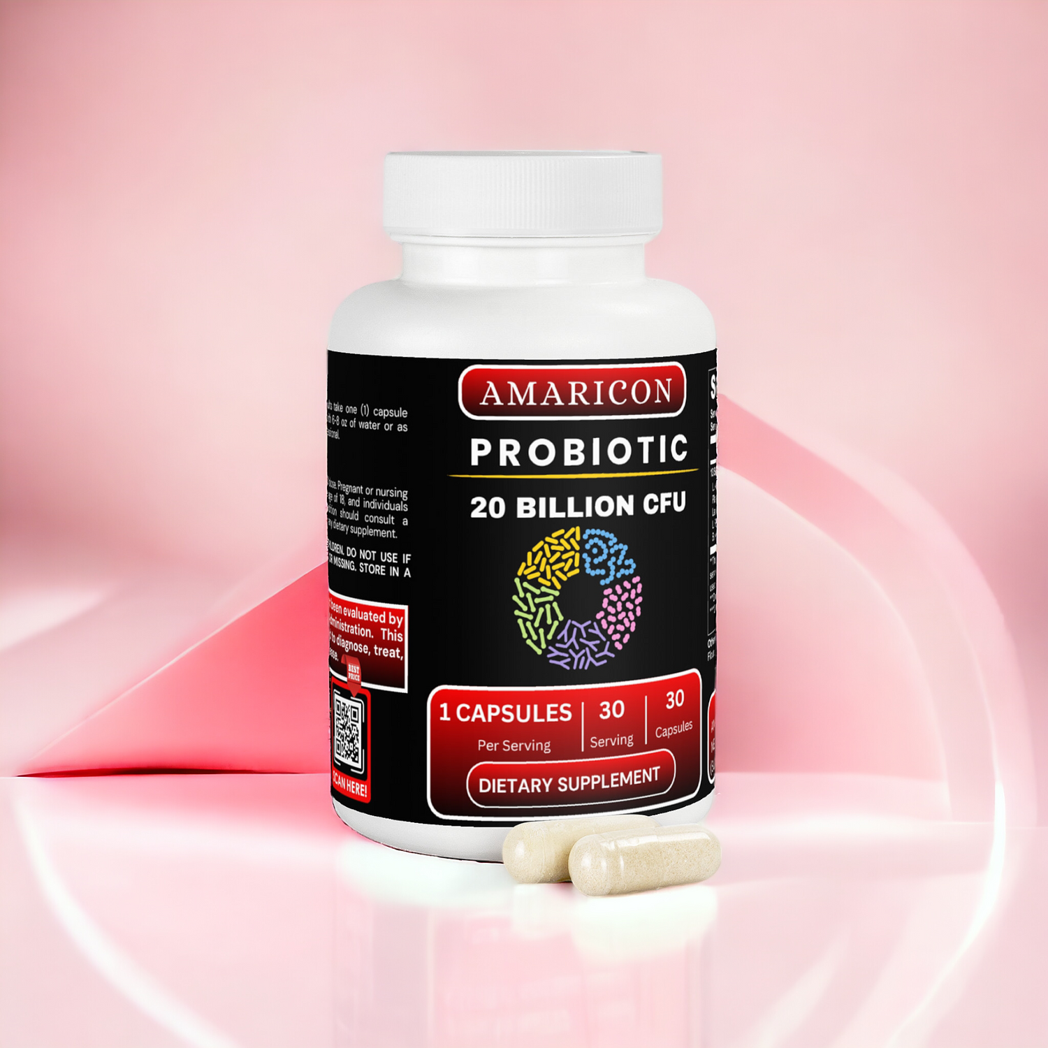 AMARICON Probiotic 20 Billion is designed to be a comprehensive solution for digestive and immune health. With 20 billion CFUs of high-quality probiotics, this supplement provides robust support for maintaining a balanced gut flora, which is essential for overall health. Free from artificial additives and packed in a vegan-friendly formula, this supplement is ideal for those seeking a natural approach to gut health. Each bottle contains 30 Capsules. As a dietary supplement, adults take one (1) capsule daily. For best results, take with 6-8 oz of water or as directed by your healthcare professional.