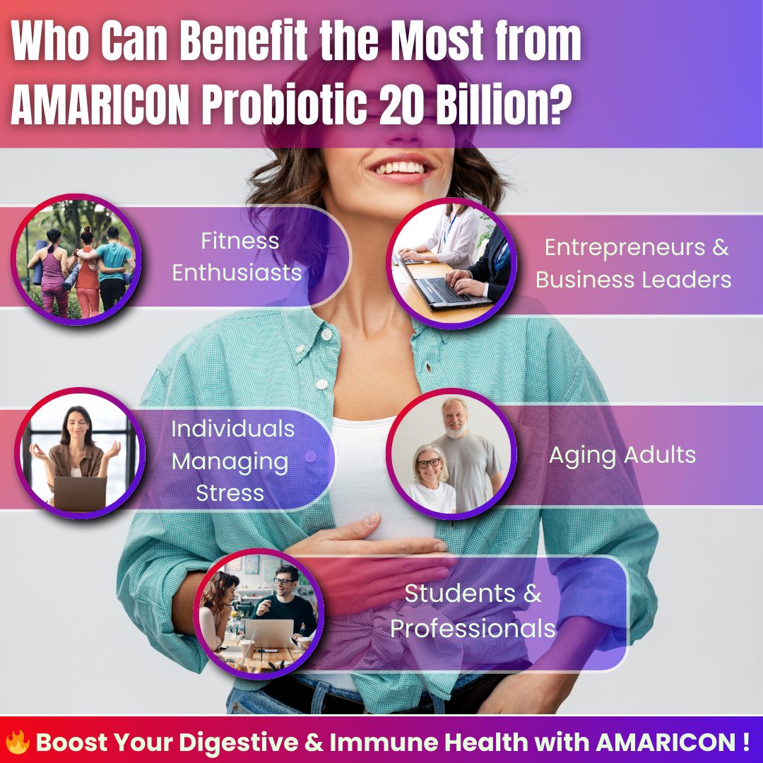 AMARICON Probiotic 20 Billion is ideal for adults seeking to improve their digestive and immune health or maintain a healthy gut flora balance as part of their overall wellness routine.