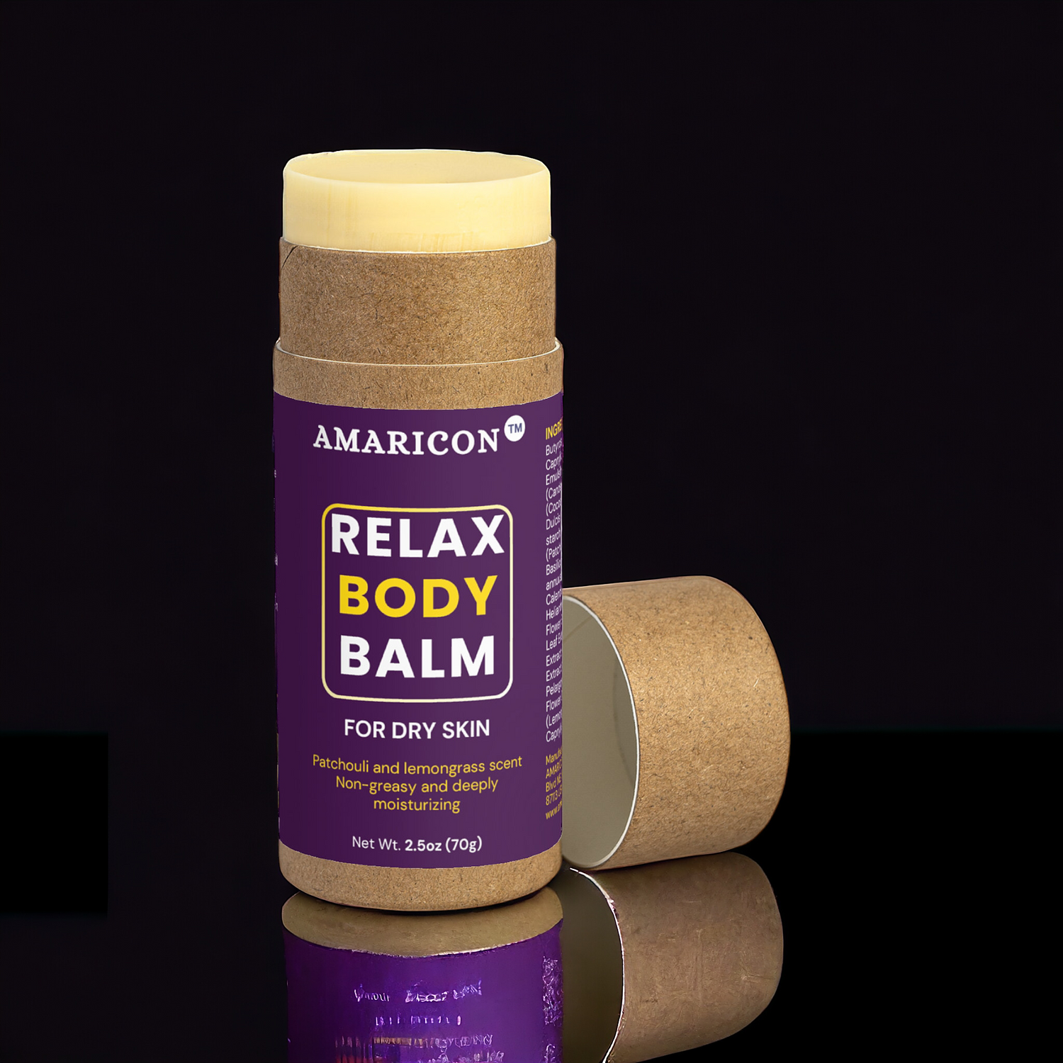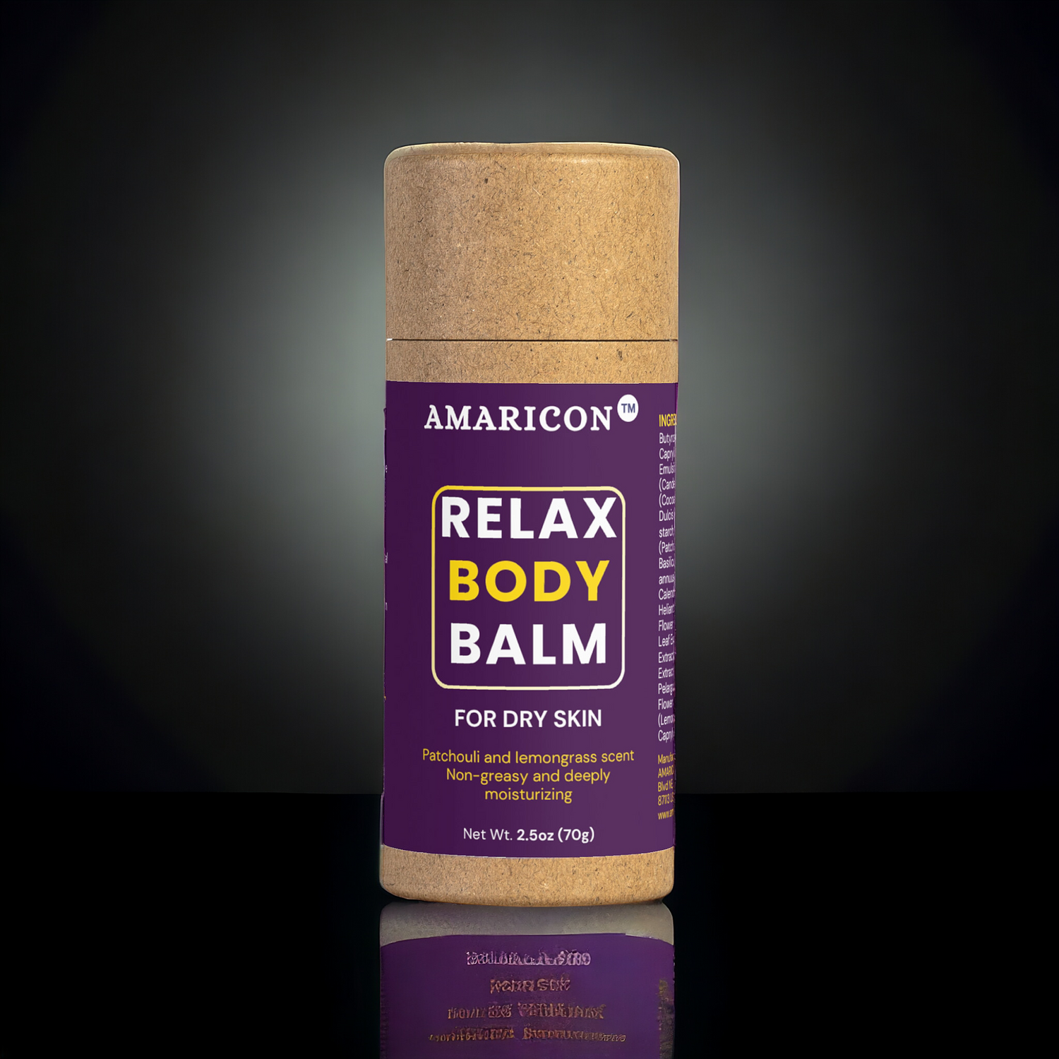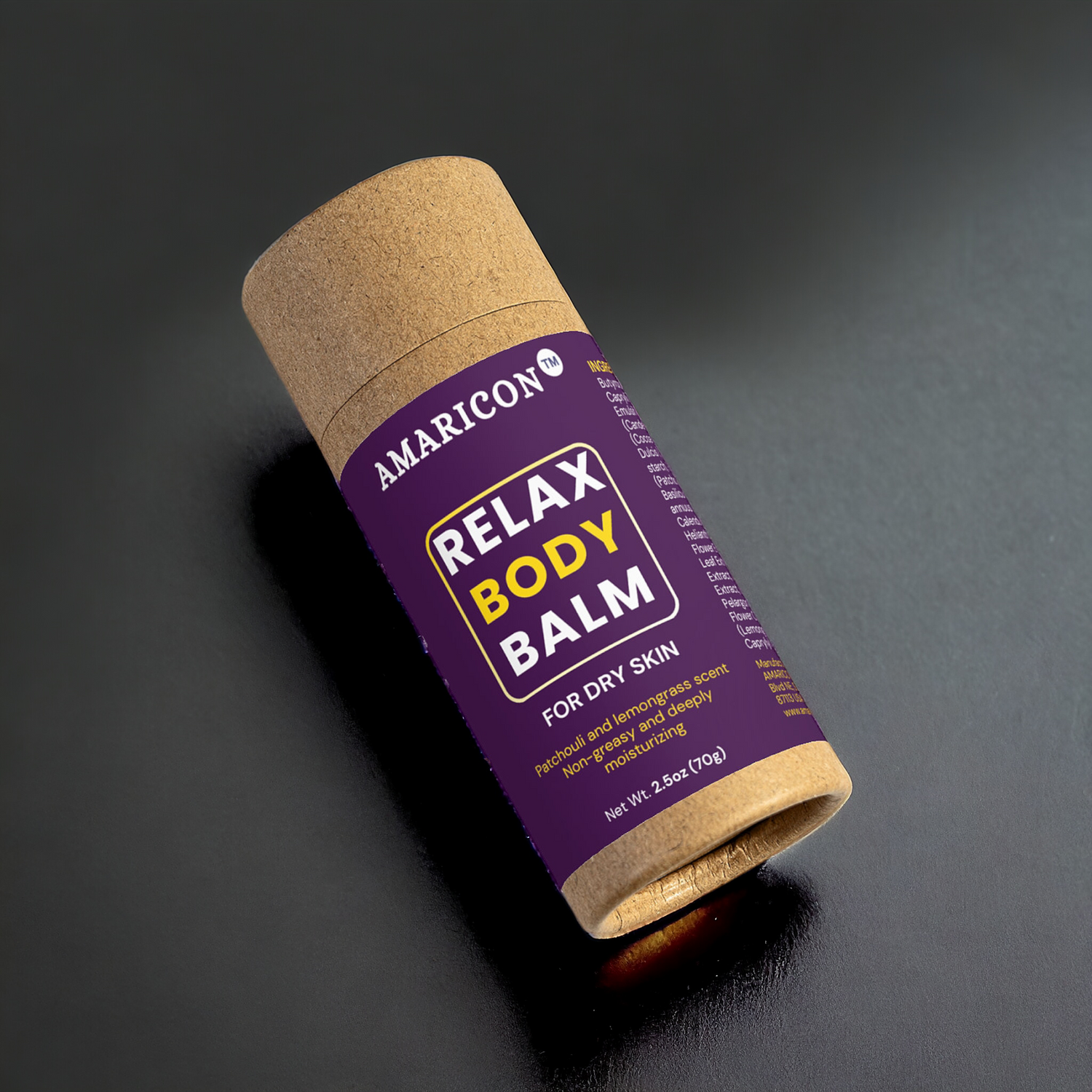 Packaged in a biodegradable container made from soybean wax and rice glue, AMARICON™ Relax Body Balm reflects a commitment to sustainability. Each balm is equivalent to two full-sized lotion bottles, reducing waste while providing premium-quality skincare. Elevate your routine with this eco-friendly choice that’s good for you and the environment.