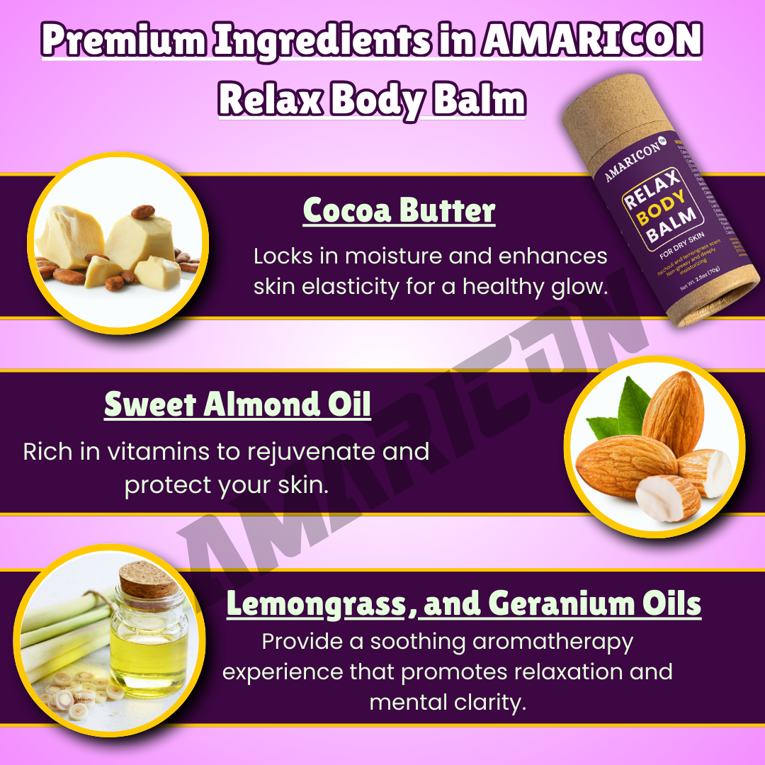AMARICON™ Relax Body Balm delivers intense hydration with a luxurious blend of Shea Butter, Cocoa Butter, and Sweet Almond Oil. Designed to replenish dry skin, this balm leaves your skin feeling soft, smooth, and deeply nourished without any sticky or greasy residue. Perfect for everyday hydration, it transforms your skincare routine into a pampering experience.